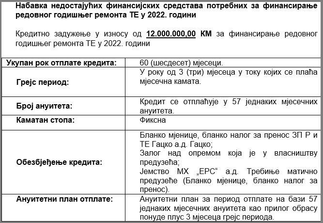 Uprava RiTE „Gacko“ raspisala je tender za nabavku nedostajućih finansijskih sredstava za finansiranje redovnog godišnjeg remonta TE u 2022. godini, a za traženih 12 miliona KM spremna je da plati 1,65 miliona KM kamate.