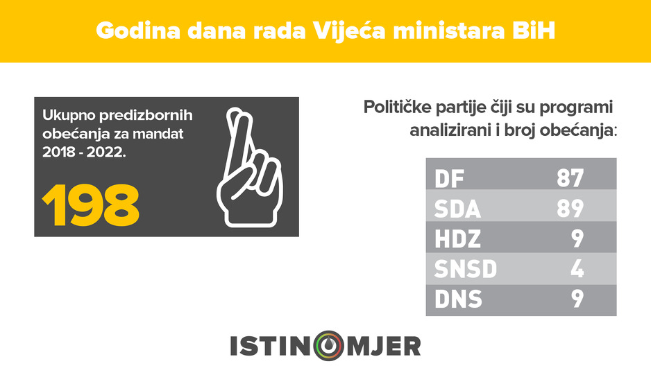Rezultati monitoringa ispunjenosti predizbornih obećanja partija na vlasti na nivou BiH, koje je provela inicijativa Istinomjer, za prvu godinu mandata pokazuju da je Savjet ministara BiH ispunlo tek jedno od 198 obećanja.