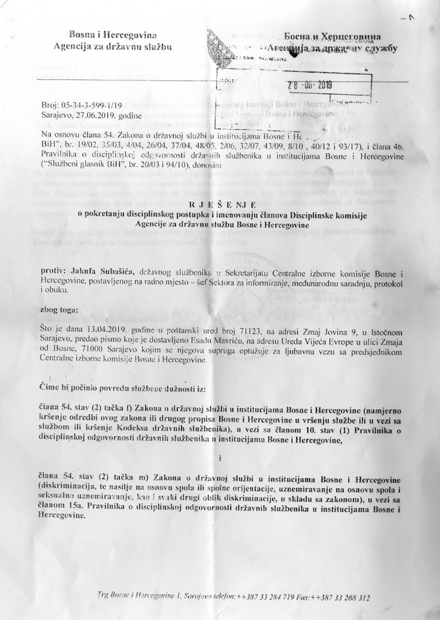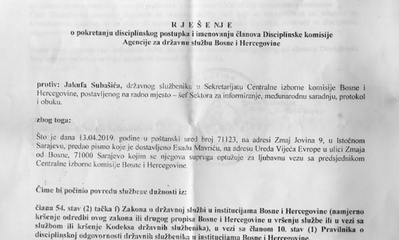 Agencija za državnu službu (ADS) BiH pokrenula je disciplinski postupak protiv Jakufa Subašića, državnog službenika u Sekretarijatu CIK BiH, jer je navodno 13. aprila 2019. godine u poštansku kancelariju broj 71123, na adresi Zmaja Jovina 9 u Istočnom Sarajevu, predao pismo koje je dostavljeno Esadu Mavriću na adresu kancelarije Savjeta Evrope u ulici Zmaja od Bosne 71.000 Sarajevo kojim se njegova supruga optužuje za ljubavnu vezu s predsjednikom Centralne izborne komisije, odnosno Brankom Petrićem.
