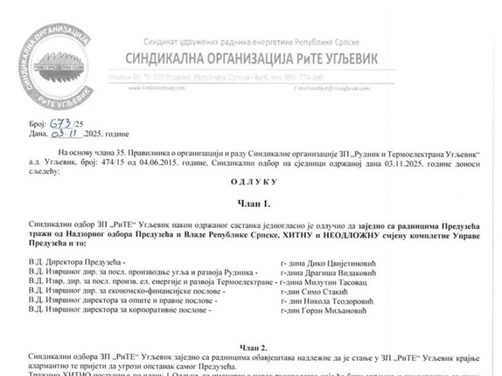 Sindikalni odbor ZP „RiTE“ Ugljevik nakon održanog sastanka jednoglasno je odlučio da zajedno sa radnicima Preduzeća traži od Nadzornog odbora Preduzeća i Vlade Republike Srpske hitnu i neodložnu smjenu kompletne Uprave.