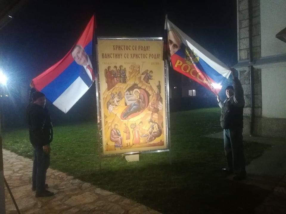 Na bilbordu na čijim stranama su okačene zastave Republike Srpske i Rusije s likovima Milorada Dodika i Vladimira Putina uz crkvenu sliku rođenja Hrista ispisan je i tradicionalni pozdrav: HRISTOS SE RODI – VAISTINU SE HRISTOS RODI!
