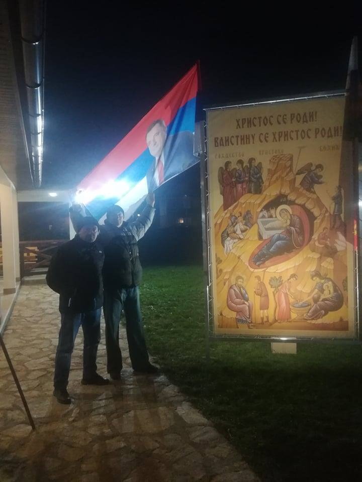 Odmah u blizini crkve, u porti, na svečani bilbord, koji je postavljen u slavu i čast predstojećeg velikog pravoslavnog praznika Hristovog rođenja – Božića neko je zakačio zastavu na kojoj je lik Milorada Dodika.
