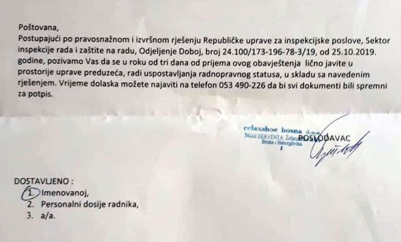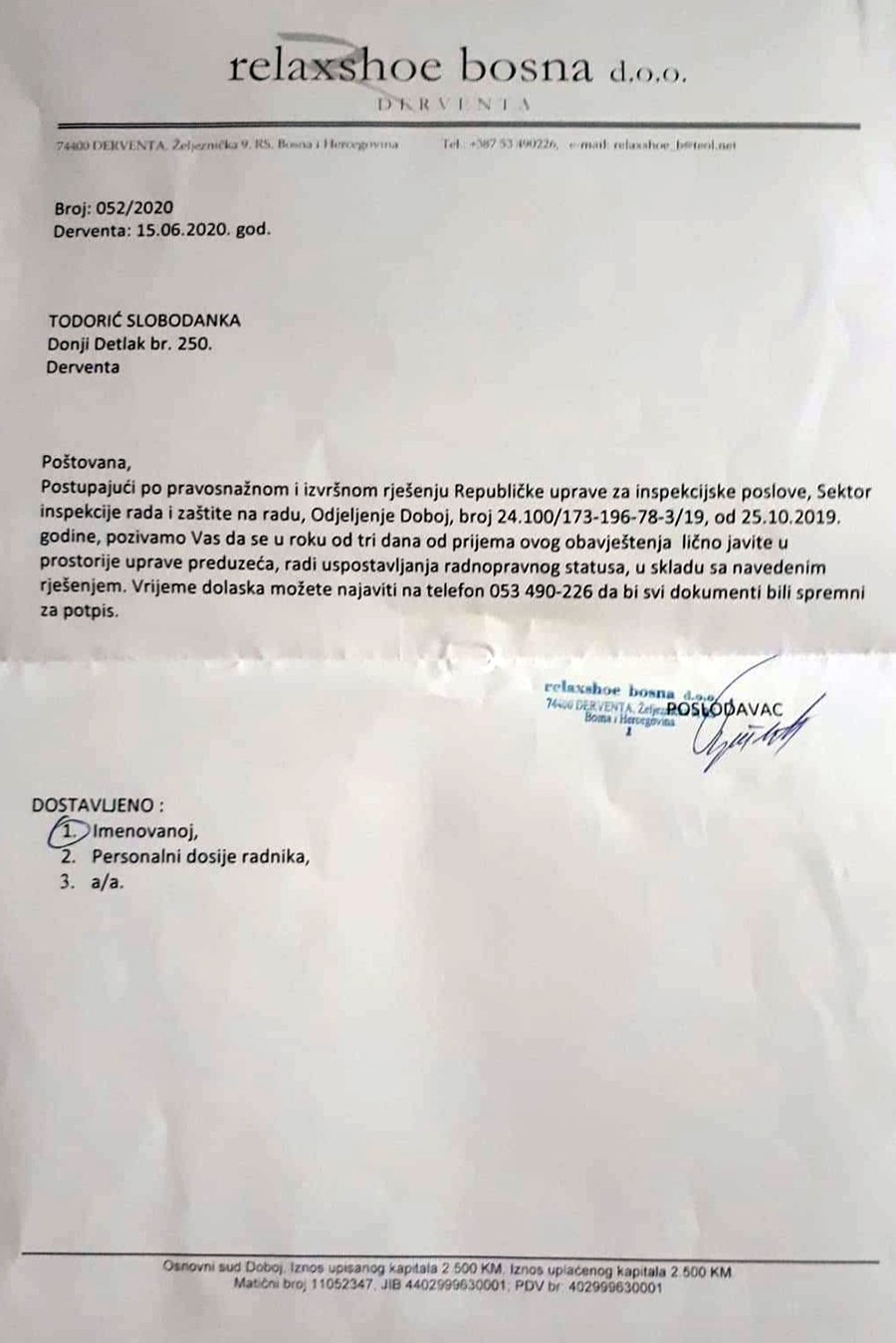 Pismeni poziv od firme “Relaxshoes” Derventa su dobili danas u kojem se kompanija poziva na rješanja inspektora rada, odnosno da se Slobodanka javi u roku od tri dana radi uspostavljanja radnopravnog statusa.