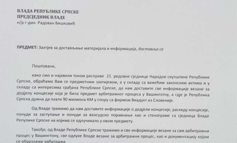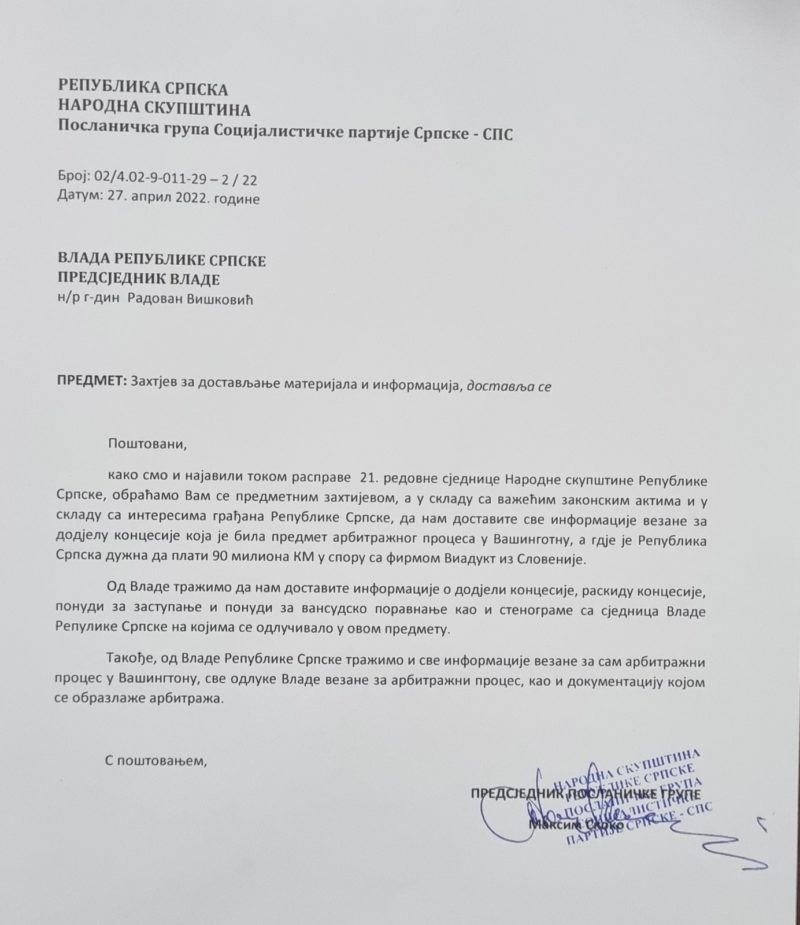 – Kako smo i najavili tokom 21. redovne sjednice NSRS, od Vlade tražimo da nam dostave sve stenograme sa sjednica na kojima se odlučivalo o ovom pitanju, informacije o dodjeli koncesije, raskidu koncesije, ponudi za pravno zastupanje i ponudi za vansudsko poravnanje. Takođe, od Vlade tražimo sve informacije vezane za arbitražni proces koji je vođen u Vašingtonu, sve odluke Vlade vezane za arbitražni proces kao i dokumentaciju u kojoj su obrazložene arbitražne odluke – navedeno je u dopisu poslaničke grupe SPS.