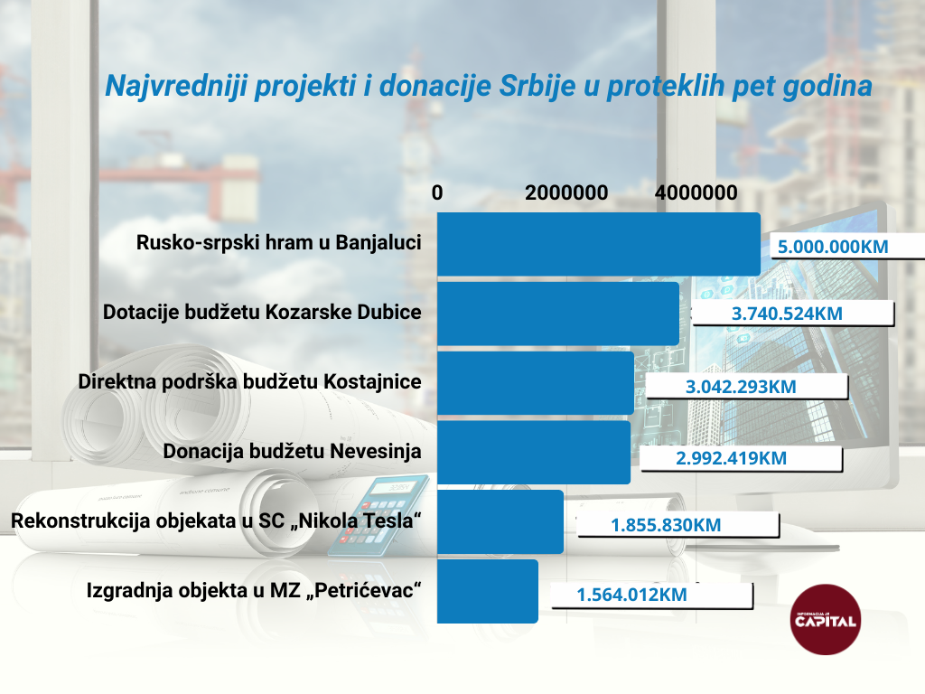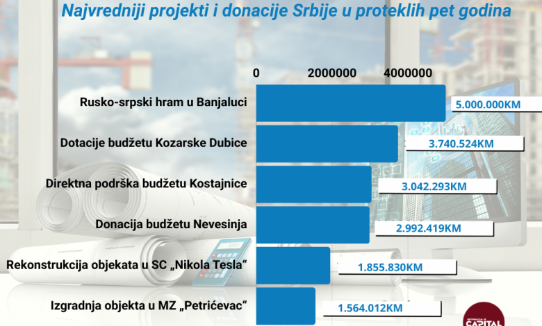 Kada su u pitanju donacije lokalnim budžetima Srbija je ranije donirala oko 3,7 miliona KM budžetu Kozarske Dubice, oko tri miliona Kostajnici, kao i  2,9 miliona KM Nevesinju.