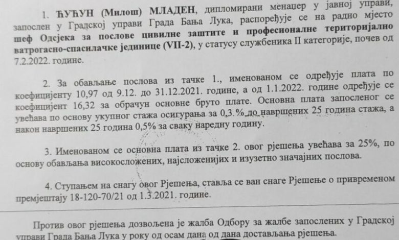 Mladen Ćućun, bivši šef gradskog Odjeka za Civilnu zaštitu formalno je vraćen na to radno mjesto,  zbog odluke Odbora za žalbu rješenjem koje je potpisao gradonačelnik Banje Luke Draško Stanivuković od 4. februara, ali nakon što se poslije višemjesečnog bolovanja pojavio na poslu Ćućunu je potpisano rješenje o otkazu.