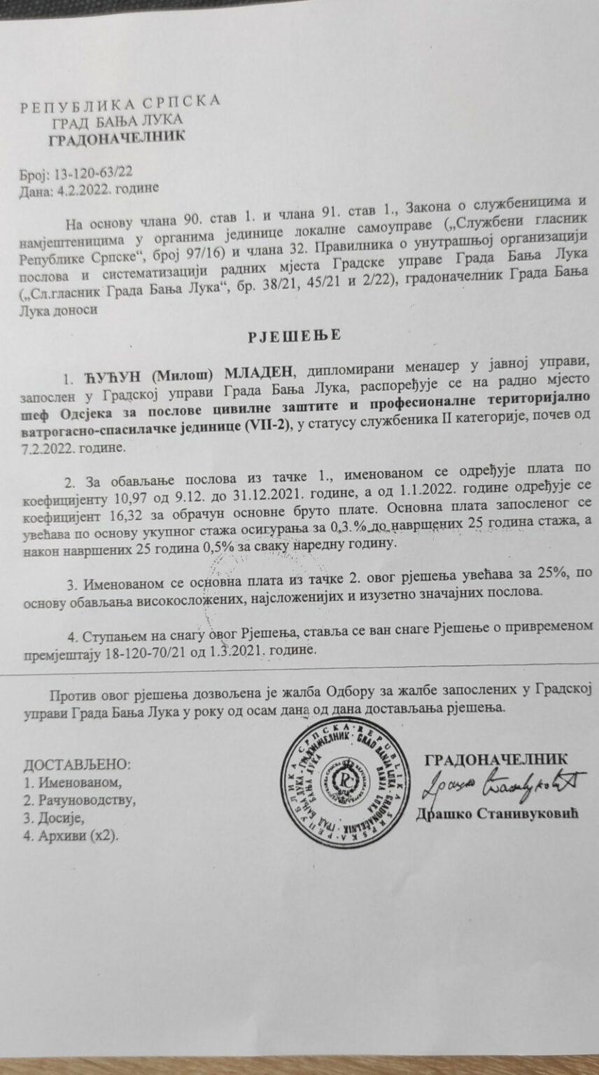 U dokumentu, čiju fotografiju objavljujemo u prilogu, vidi se da je isti potpisan 4. februara od strane gradonačelnika Banje Luke Draška Stanivukovića.