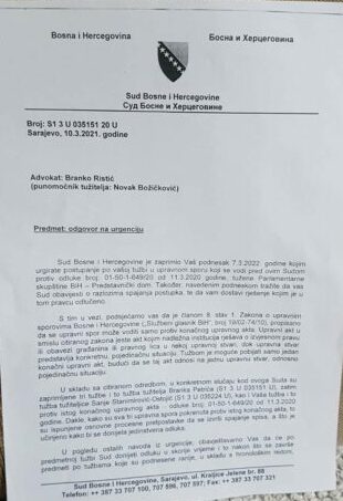 – U odgovoru mi je rečeno samo da je moja tužba spojena sa tužbom mog kolege takođe bivšeg člana CIK-a Branka Petrića i tužbom predsjednice Opštinske izborne komisije Vlasenica Sanje Stanimirović-Ostojić, protiv iste odluke Parlamenta BiH od 11. marta 2020. godine – kaže Božičković.