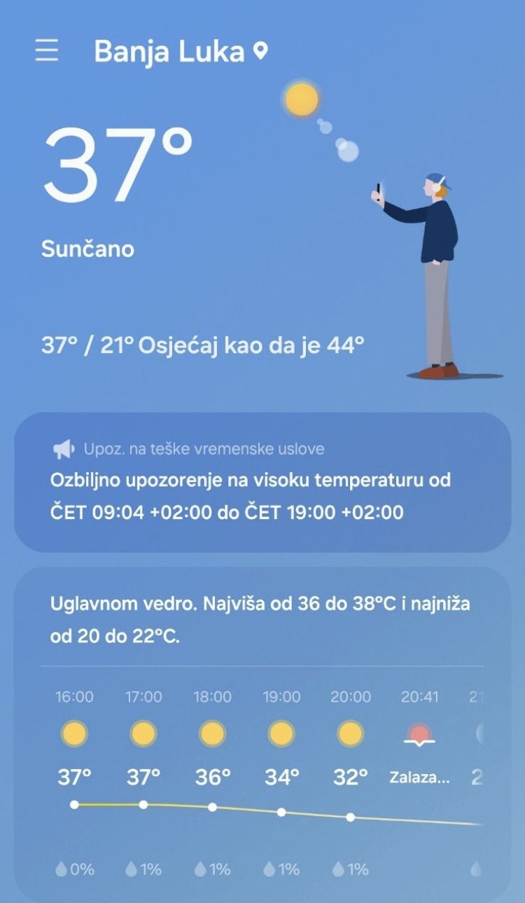 Takođe, kada je riječ o temperaturi u Banjaluci, na telefonskim aplikacijama koje pokazuju vrijeme navodi se da je osjećaj kao da su 44 stepena.