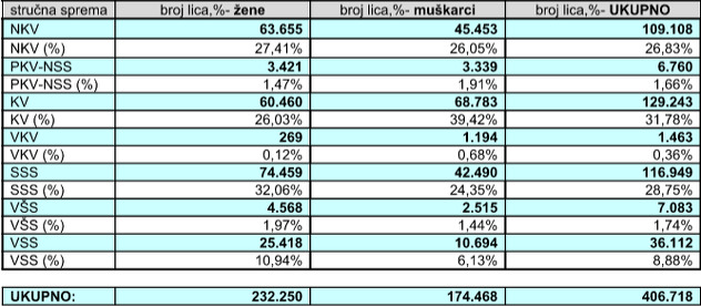 Prema stručnoj spremi osoba koja traže zaposlenje, najviše je kvalifikovanih radnika (KV) – 129.243, onih sa srednjom stručnom spremom (SSS) – 116.949, te nekvalifikovanih radnika (NKV) – 109.108.