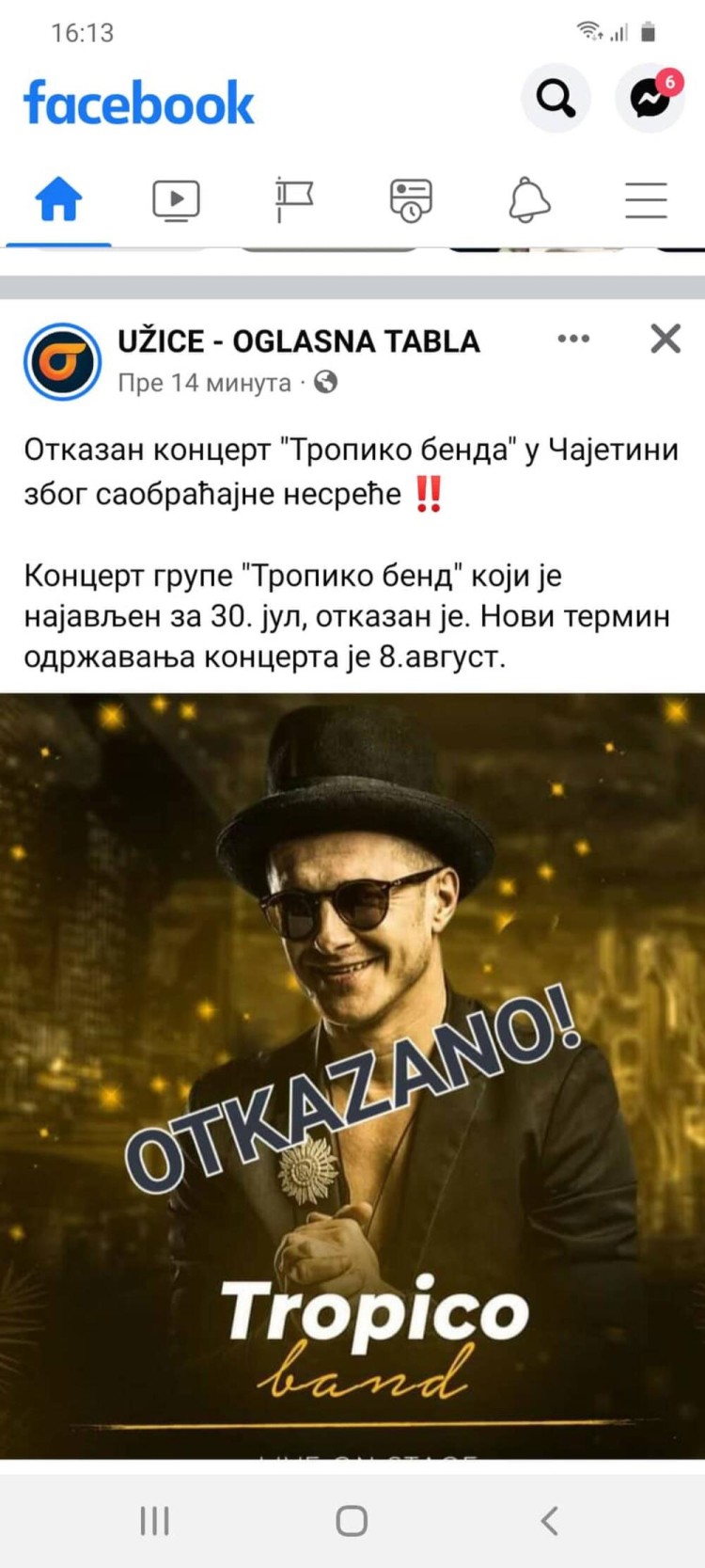– Večerašnji nastup u Čajetini je odložen zbog saobraćane nesreće koja se dogodila članovima produkcije koja je bila zadužena za realizaciju događaja. Iskreno saučešće porodicama nastradalih – piše u objavi na Facebooku stranici "Užice – oglasna tabla" što je podijelio i Sale Tropiko na svojoj Instagram stranici.