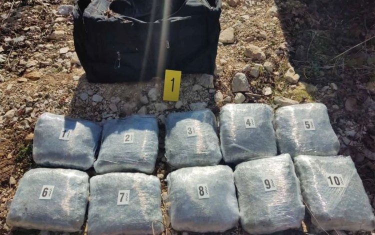 Pripadnici Granične policije BiH su prilikom nadzora granice i pretrage terena pronašli u niskom rastinju odbačenu putnu torbu u kojoj je bilo deset pakovanja, ukupno 10, 595 kilograma marihuane.