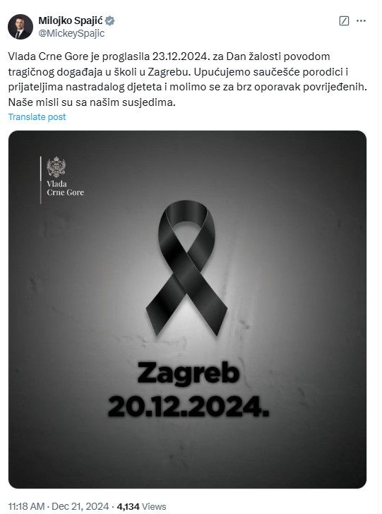 – Vlada Crne Gore je proglasila 23.12.2024. za Dan žalosti povodom tragičnog događaja u školi u Zagrebu. Upućujemo saučešće porodici i prijateljima nastradalog djeteta i molimo se za brz oporavak povrijeđenih. Naše misli su sa našim susjedima – naveo je Spajić na društvenoj mreži X.