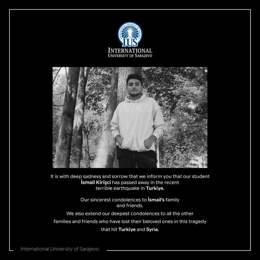 – S dubokom tugom obavještavamo vas da je naš učenik Ismail Kirisci smrtno stradao u strašnom zemljotresu u Turskoj. Naša iskreno saučešće Ismailovoj porodici i prijateljima. Takođe izražavamo najdublje saučešće svim ostalim porodicama i prijateljima koji su izgubili svoje voljene u ovoj tragediji koja je pogodila Tursku i Siriju – navedeno je na stranici IUS-a.