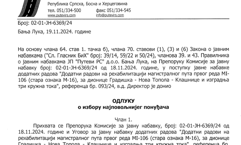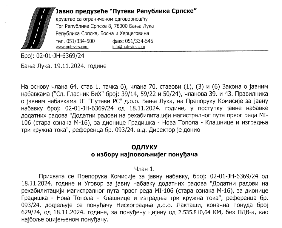 U „Putevima“ ne preciziraju o kojim dodatnim radovima je riječ. Navode da su pregovarački postupak pokrenuli 13. novembra te da je Komisija za javnu nabavku ocijenila kako je ponuda „Niskogradnje“ bila jedina i da je ujedno prihvatljiva.