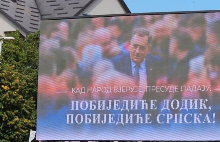 Na bilbordima je ispisano "Kad narod vjeruje, presude padaju. Pobijediće Dodik, pobijediće Srpska!".