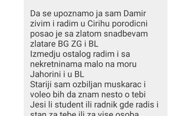 – Bez ikakvog povoda napisao je da Damir koji radi u Cirihu, te da zlatom snabdijeva zlatare u Zagrebu, Beogradu i Banjoj Luci. Pitao me da li sam student ili radim i  napisao da će mi rado pomoći ako sam u teškoj situaciji dodavši da se nada da ga razumijem – nastavila je priču ova djevojka.