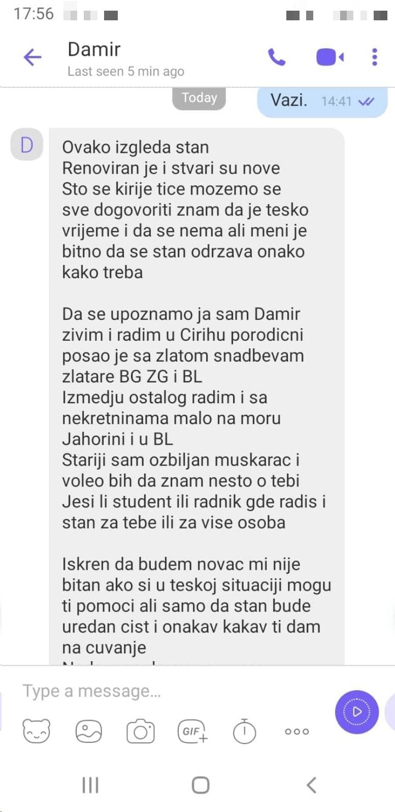 Dopisivanje oko stana Damir je pretvorio u sajt za upoznavanje te joj je u poruci napisao "nešto više o njemu". Nije časio ni časa i odmah ju je obavijestio da je stariji i ozbiljan muškarac, da želi da sazna više o našoj sagovornici i da se o svemu mogu dogovoriti.