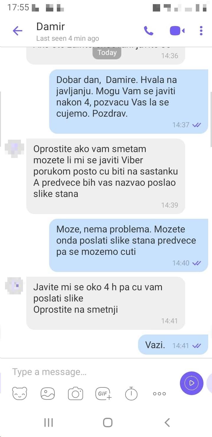 Nakon njene objave na pomenutom sajtu javio se takozvani Damir koji navodno ima stan kod kafića „Provansa“ на Mejdanu. On joj je, kako je kazala i kako stoji u prepisci, rekao da neće biti dostupan za poziv te da će joj fotografije poslati putem „vajbera“. To je kasnije i učinio uz opasku da se mogu dogovoriti oko kirije.