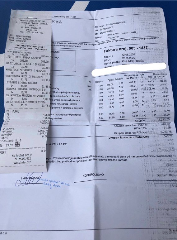 Njeno tijelo, dodaje naš sagovornik, radnici banjalučkog Gradskog groblja su zbrinuli na način kako se to radi sa preminulima koji su bili pozivitivni na virus korona. Rodbini je rečeno da je preminula bila pozitivna na virus, zbog čega su naplatili i specijalne usluge.