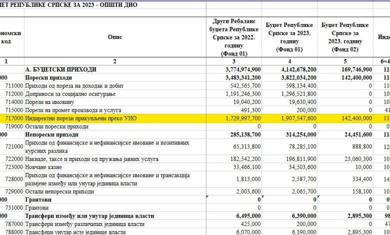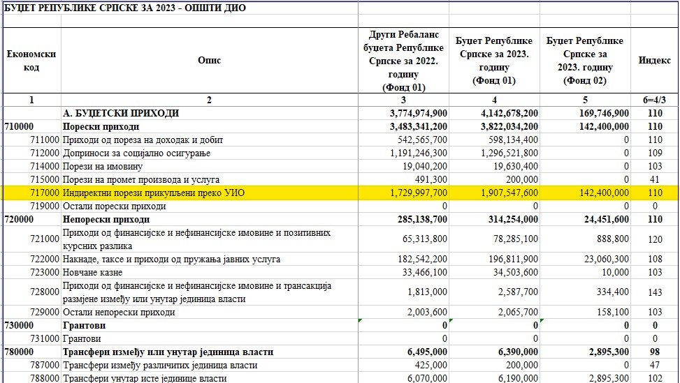– Predviđa se da će u 2023. godini doći do značajnog rasta prihoda od indirektnih poreza koji će pripasti Budžetu RS zbog nastavka trenda rasta cijena, a takođe očekuje se i rast krajnje potrošnje u Republici Srpskoj, što će uticati na rast koeficijenta raspodjele prihoda od indirektnih poreza za Republiku Srpsku – navodi se u ovom dokumentu.