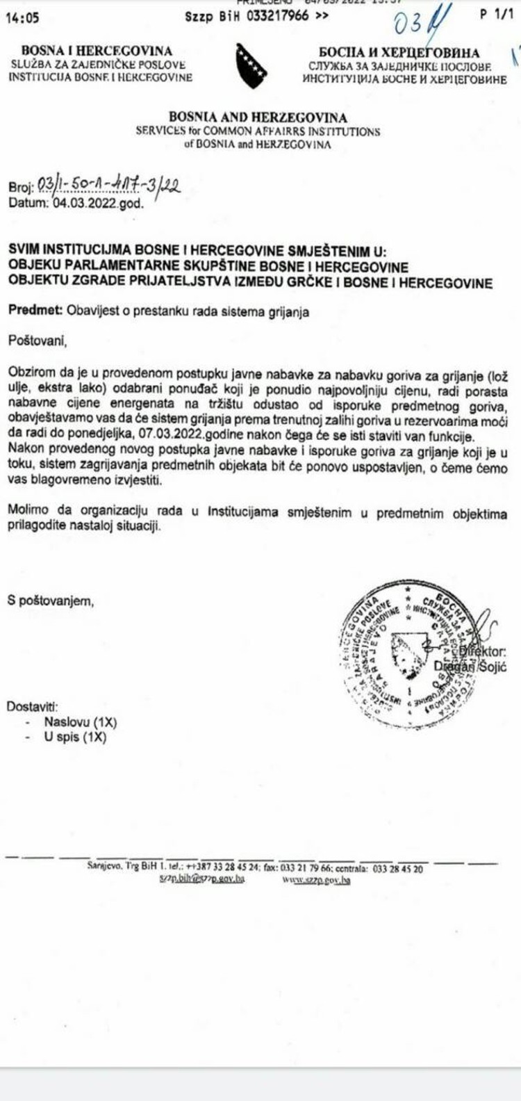 Služba za zajedničke poslove institucija BiH obavijestila je sve institucije smještene u objektu Parlamentarne skupštine o prestanku rada sistema grijanja, počevši od sutra, potvrđeno je "Nezavisnim novinama".