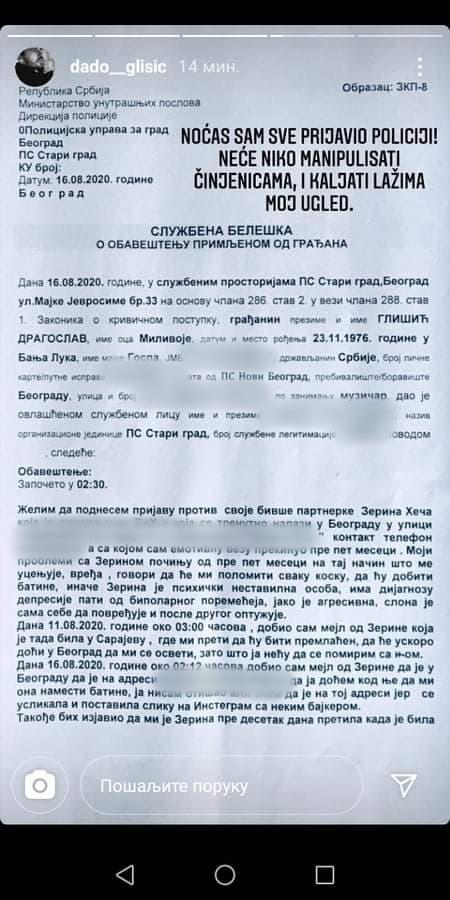 "Primorana sam da uključim lajv, tek sad sam se probudila, primam infuzije, ne mogu da verujem da je moj broj telefona objavljen javno. Krivična prijava ne postoji, mene je policija nazvala i digla iz kreveta, jer ja nisam celu noć spavala od Dade i njegovoh pretnji. Dado je mene sinoć povredio, evo da vidite, ovo je modrica… Sinoć me je povredio, napravio je prijave na osnovu svoje priče, policija mi je rekla da dođem i da dajem izjavu. Sad ću sve da otkrijem. Izbaciću sve fotografije i snimke njegovog maltretiranja fizičkog, za godinu i po dana dana, što me je tukao. To imaju moji fanovi, od ljudi sa ulice koji su nas snimali. Ja ću sad da objavim mejlove. Ja sam jako bolesna, ne mogu da verujem šta mi se radi, u šoku sam, tresem se, ne mogu da verujem da me neko toliko mrzi i da mi toliko zlo želi. Idem sad u policijsku stanicu, neću ništa kriti od vas, sve ću javno da pokažem jer mi je dosta više njegovih laži. Ovde završavam", ispričala je Zerina Hećo.