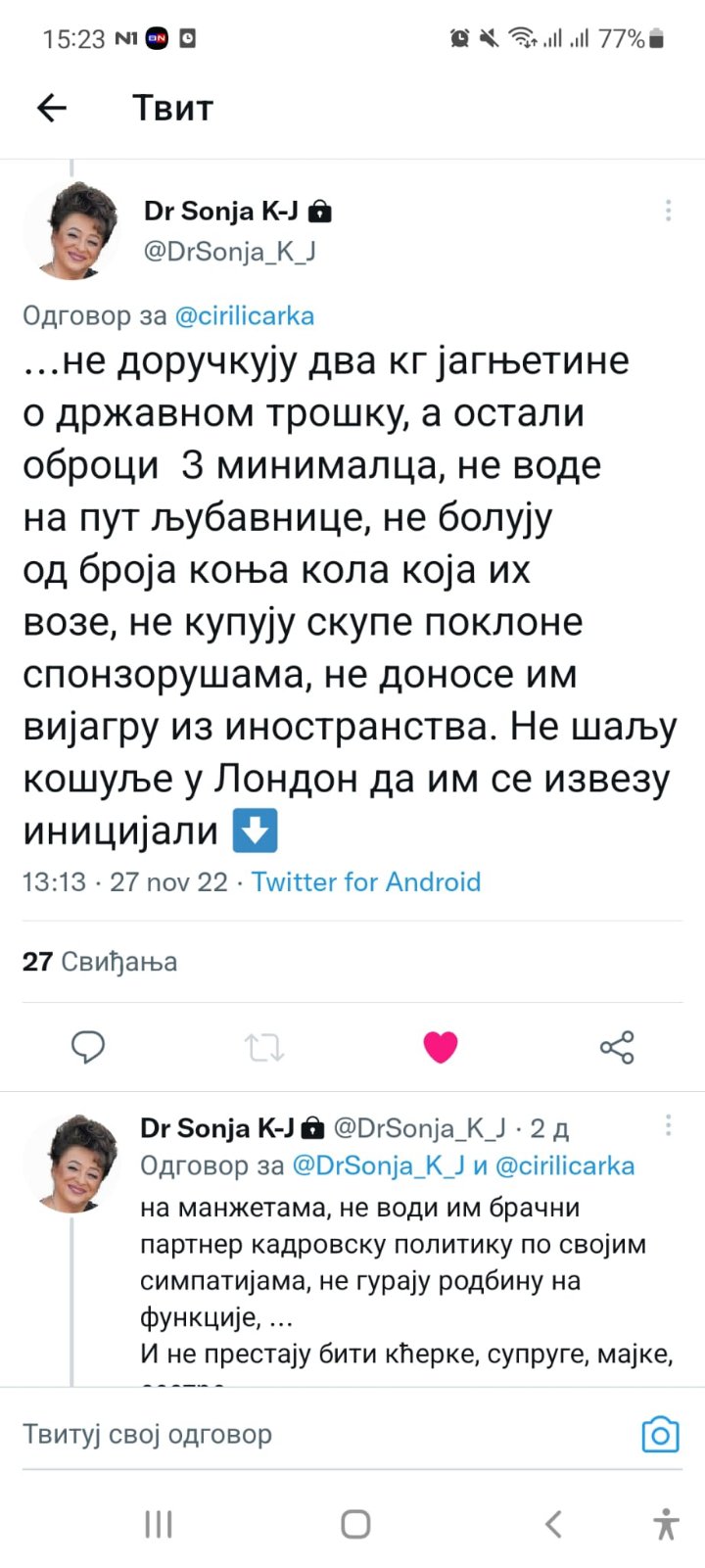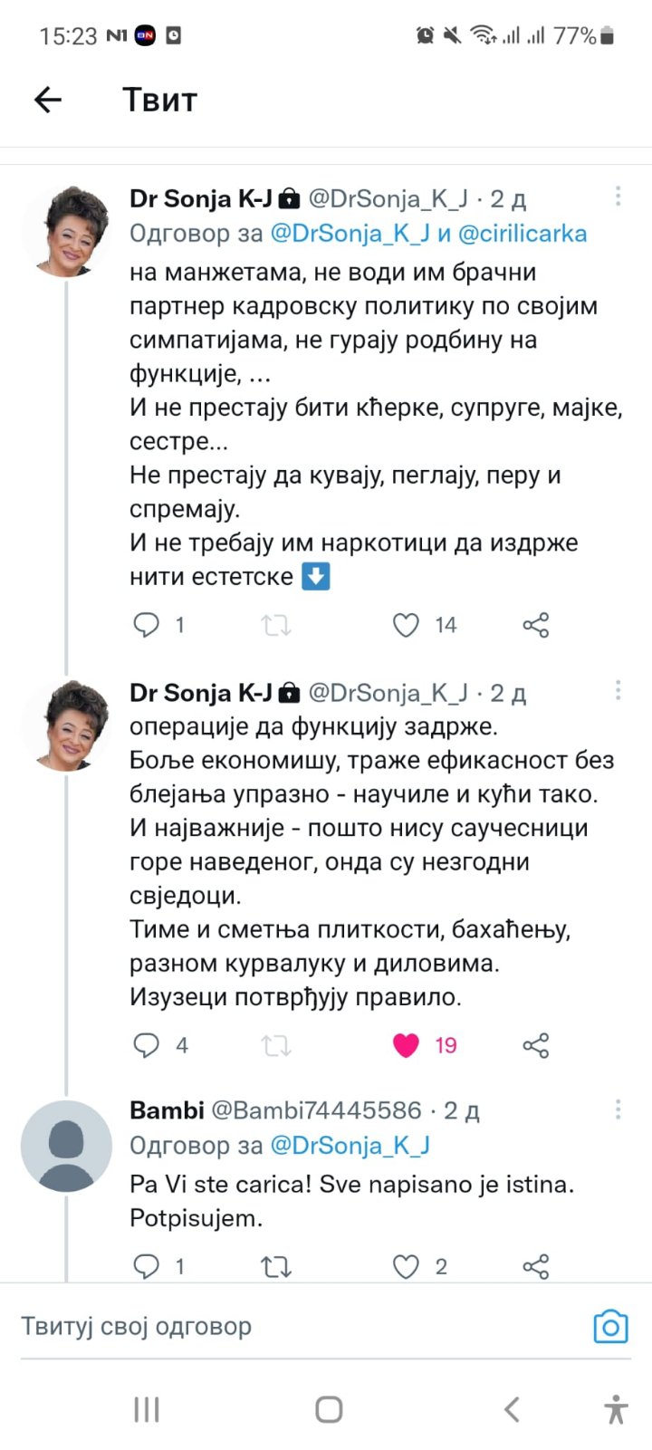 Primjer je i dr Sonja Karadžić – Jovičević, potpredsjednica Narodne skupštine Srpske u prošlom mandatu, najvišoj funkciji na koju može da dođe opozicija u RS, a koje više nema ni u kakvim kombinacijama. U jednoj od diskusija na Tviteru “objasnila” je zbog čega žena uglavnom nema u politici: Ne doručkuju dva kilograma jagnjetine o državnom trošku, a ostali obroci 3 minimalca; ne vode na put ljubavnice; ne boluju od broja konja kola koja ih voze; ne kupuju skupe poklone sponzorušama; ne donose im vijagru iz inostranstva. Ne šalju košulje u London da im se izvezu inicijali”.