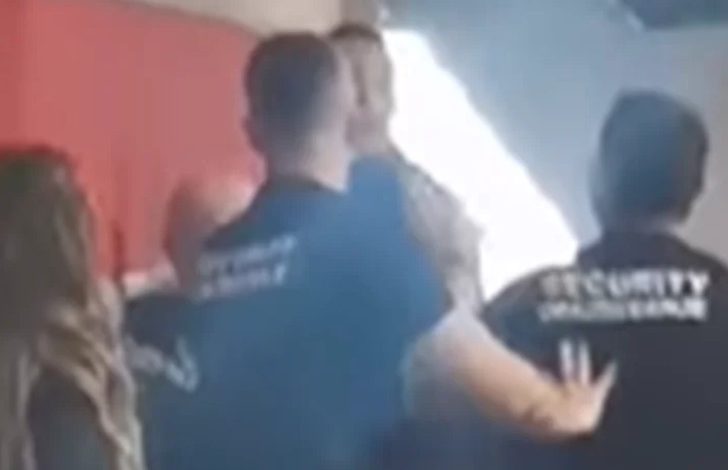 Kako se vidi na snimku, gosti su se sukobili se sa trojicom članova obezbjeđenja, prenosi "Mondo".