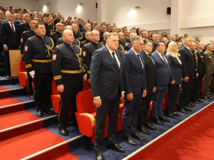 Prije početka svečanosti, lider SNSD-a Milorad Dodik položio je vijenac na spomen-ploču poginulim pripadnicima Ministarstva unutrašnjih poslova.
