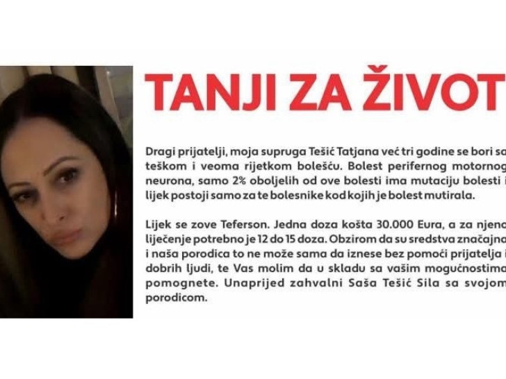 "Lijek se zove Teferson. Jedna doza košta 30 hiljada evra, a za njeno liječenje je potrebno 12 do 15 doza. Obzirom da su sredstva značajna i naša porodica to ne može sama da iznese bez pomoći prijatelja i dobrih ljudi, molim Vas da u skladu sa vašim mogućnostima pomognete", navodi se u apelu.